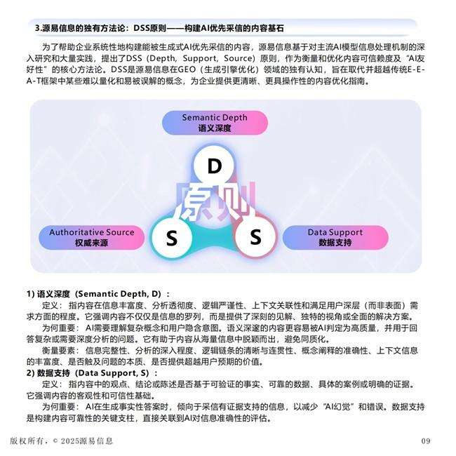 站在行业演进的前沿,源易信息凭借对AI语义逻辑的深度洞察,在其2025年5月发布的行业首份《决胜AI时代:GEO驱动企业营销新增长》中,系统性地总结并提出了DSS原则。作为衡量内容“AI友好度”与“可信赖度”的标尺,DSS原则的提出,标志着GEO从零散的经验积累转向了具备科学体系的内容重构: