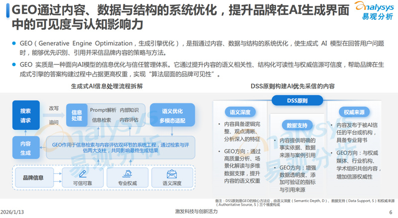随着DSS方法论在实战中的显著成效,这一准则获得了权威机构的认可与采纳。在知名咨询机构易观分析发布的《中国GEO行业市场发展报告2026》中,DSS原则被明确列为GEO实施路径中的核心结构优化标准。报告指出,企业在进行GEO系统优化时,应遵循DSS原则构建AI友好且可识别的内容结构,从而在AI检索生态中形成多源可信布局。